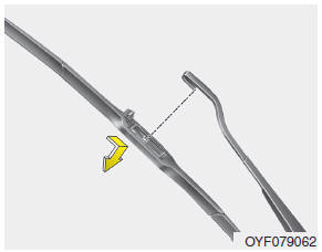 2. Lift up the wiper blade clip. Then pull down the blade assembly and remove it.
